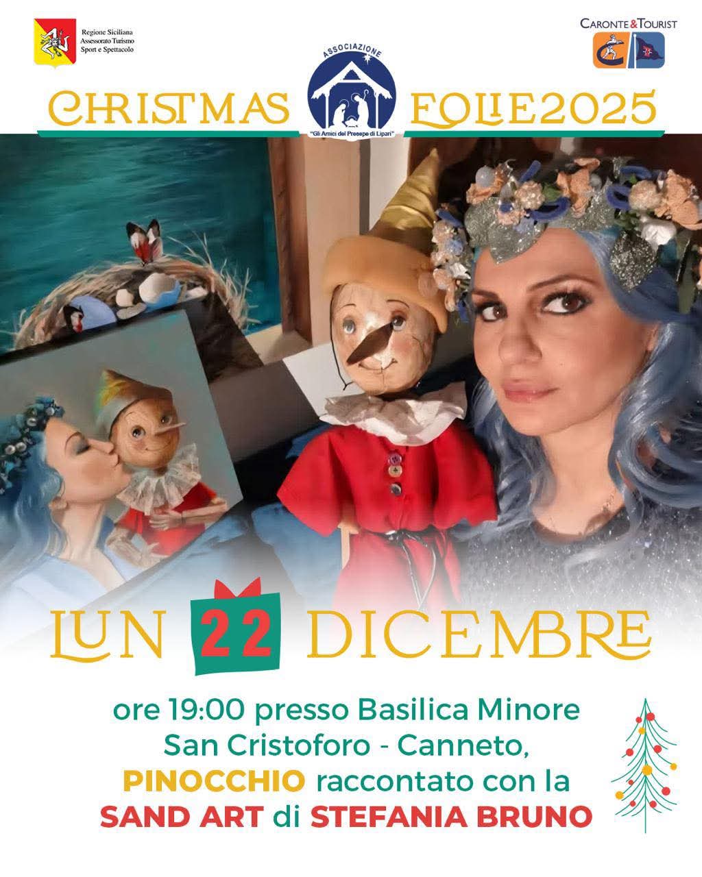 Pinocchio, una fiaba senza tempo. Attraverso la tecnica della Sand art, Stefania Bruno racconta le vicende del burattino più famoso del mondo, creando e trasformando i quadri di sabbia a tempo di musica. La particolarità di questo spettacolo è che, contemporaneamente alla creazione del disegno, Stefania racconterà la storia, caratterizzando le voci dei vari personaggi.