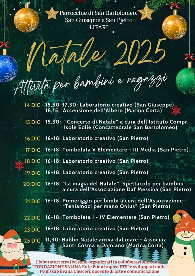 - 20 dicembre, 16:00–18:00, La magia del Natale, spettacolo per bambini a cura dell’Associazione DAF Messina (San Pietro)